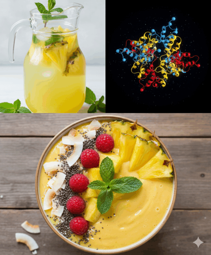 - Enzimas, en particular bromelina (o bromelaína). Esta enzima proteolítica ayuda a descomponer proteínas y tiene efectos antiinflamatorios. Está presente en la piña entera, incluyendo la cáscara. abc.com.py+3ir.uitm.edu.my+3journalofmedula.com+3